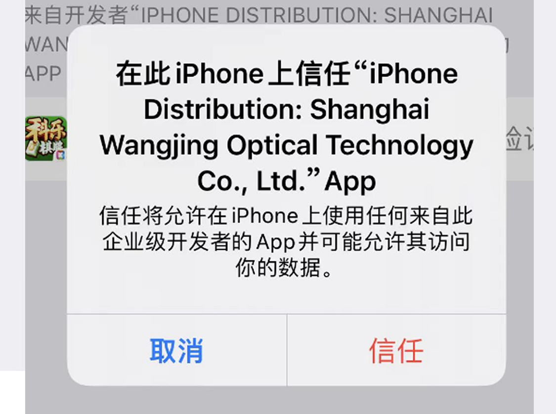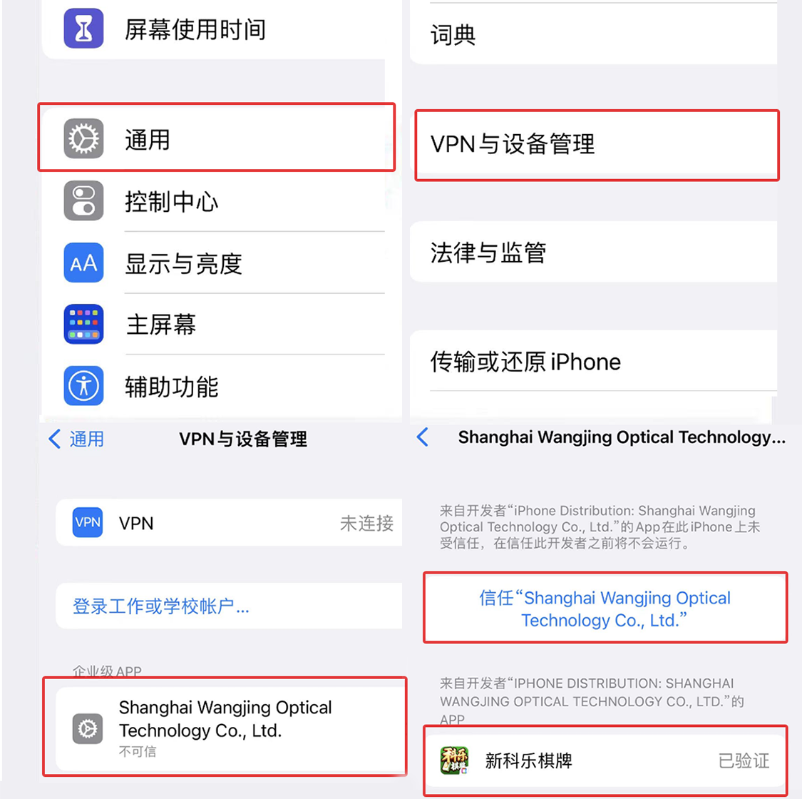 由于IOS系统权限调整,打开应用需要进入【设置>>通用>>描述文件】(IOS9上叫“描述文件”,IOS10上叫“设备管理”),信任同名的描述文件即可.